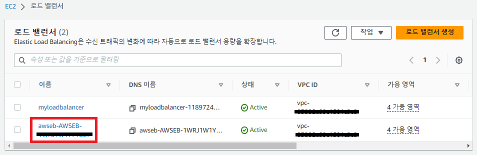 해결 방법: Elastic Beanstalk 환경과 로드 밸런서를 동일한 VPC 내부에 위치시킵니다.