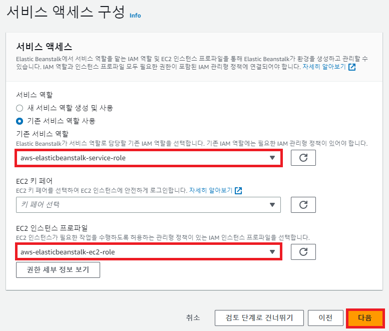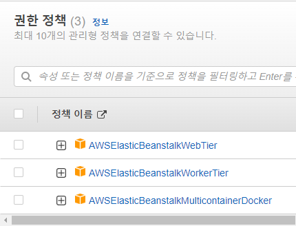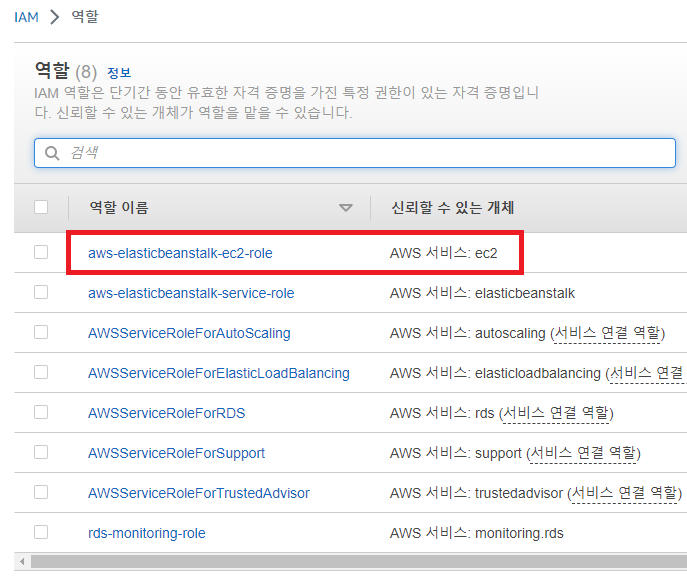 aws-elasticbeanstalk-ec2-role [AWS 서비스: ec2]가 있어야 한다