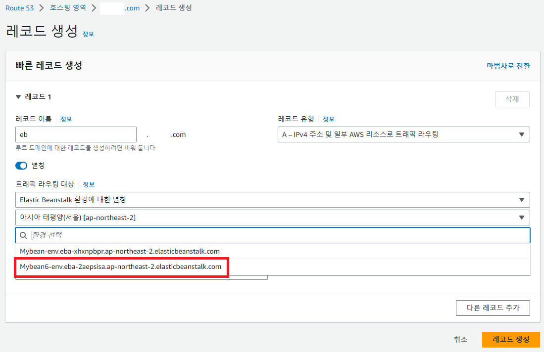 Elastic Beanstalk 환경에 대한 별칭으로 선택하고