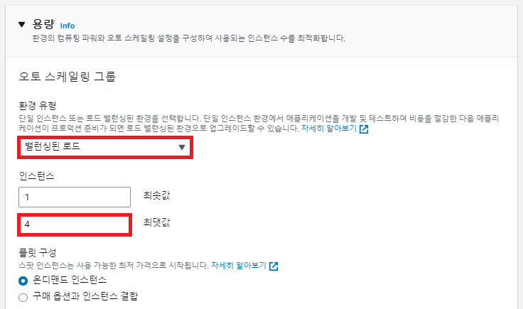 해결 방법: Elastic Beanstalk 환경을 수정하고, 인스턴스 수를 2개 이상으로 늘립니다.