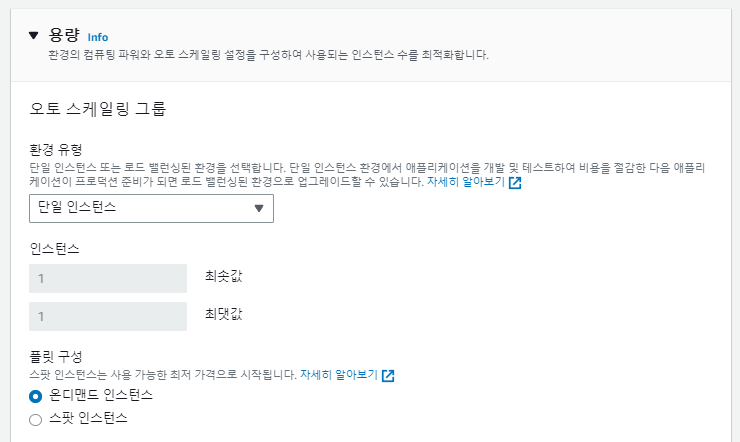 환경이 Single Instance로 설정되어 있는 경우: Elastic Beanstalk에서 로드 밸런서를 생성하려면, 최소한 2개의 인스턴스가 필요합니다. 따라서 환경이 Single Instance로 설정되어 있는 경우, 로드 밸런서가 생성되지 않습니다.