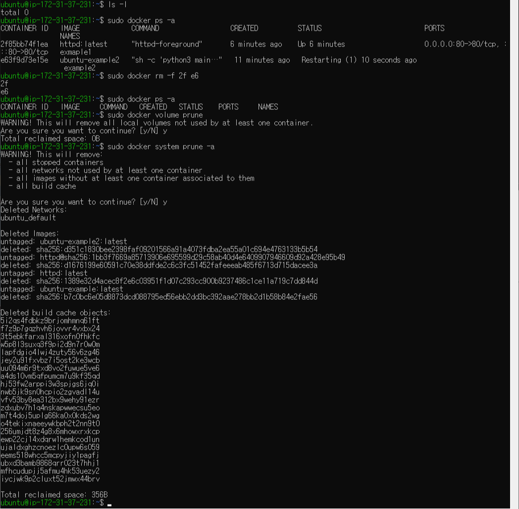 sudo docker system prune -a : Docker에서 사용하지 않는 리소스를 정리하는 명령어