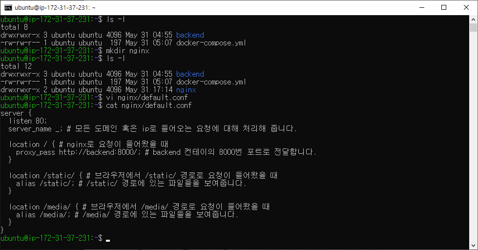 proxy_pass http://backend:8000/; # backend 컨테이의 8000번 포트로 전달합니다.
