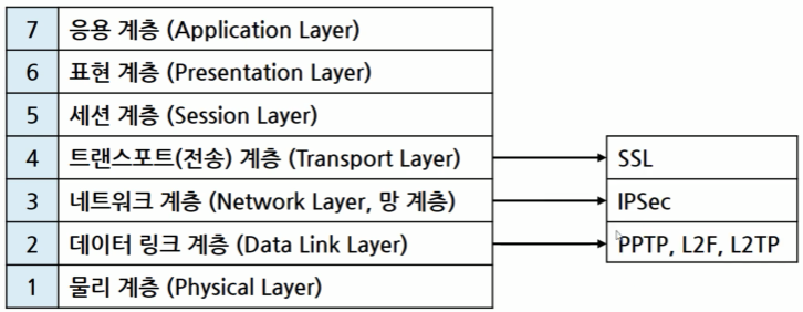 - IPSec VPN : VPN 서버가 설치된 각각의 네트워크를 서로 연결하는 방식(암호화 - IPSec 프로토콜)