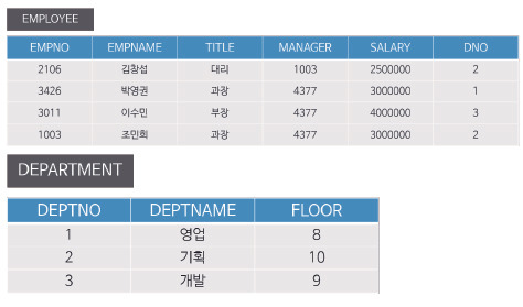 2. SELECT EMPNAME, TITLE FROM EMPLOYEE WHERE DNO = (SELECT DEPTNO FROM DEPARTMENT WHERE FLOOR = 8 OR FLOOR =9);