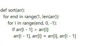 지문에 주어진 파이썬 프로그램은 어떤 알고리즘을 구현한 것이다. 오름차순으로 정렬되는 알고리즘이고 리스트의 끝(end)이 점점 늘어난다.