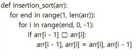 주어진 지문은 삽입정렬을 파이썬으로 작성한 것이다. □안에 들어갈 기호는? 단 오름차순으로 정렬하는 프로그램이다.