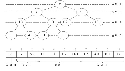 1. 깊이 0의 노드는 배열의 0번 요소에 저장.
