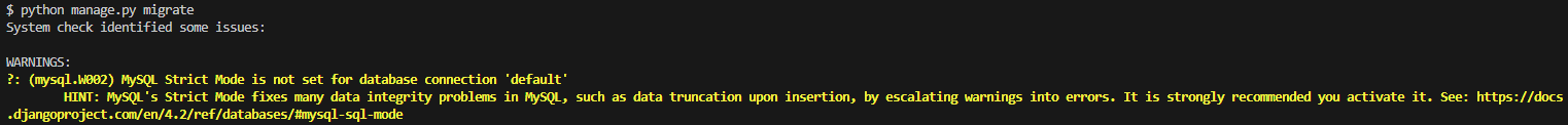 Django와 MySQL 사용중 migrate를 하니 발생한 에러 WARNINGS: ?: (mysql.W002) MySQL Strict Mode is not set for database connection 'default' HINT: MySQL's Strict Mode fixes many data integrity problems in MySQL, such as data truncation upon insertion, by escalating warnings into errors. It is strongly recommended you activate it. See: https://docs.djangoproject.com/en/4.2/ref/databases/#mysql-sql-mode https://..